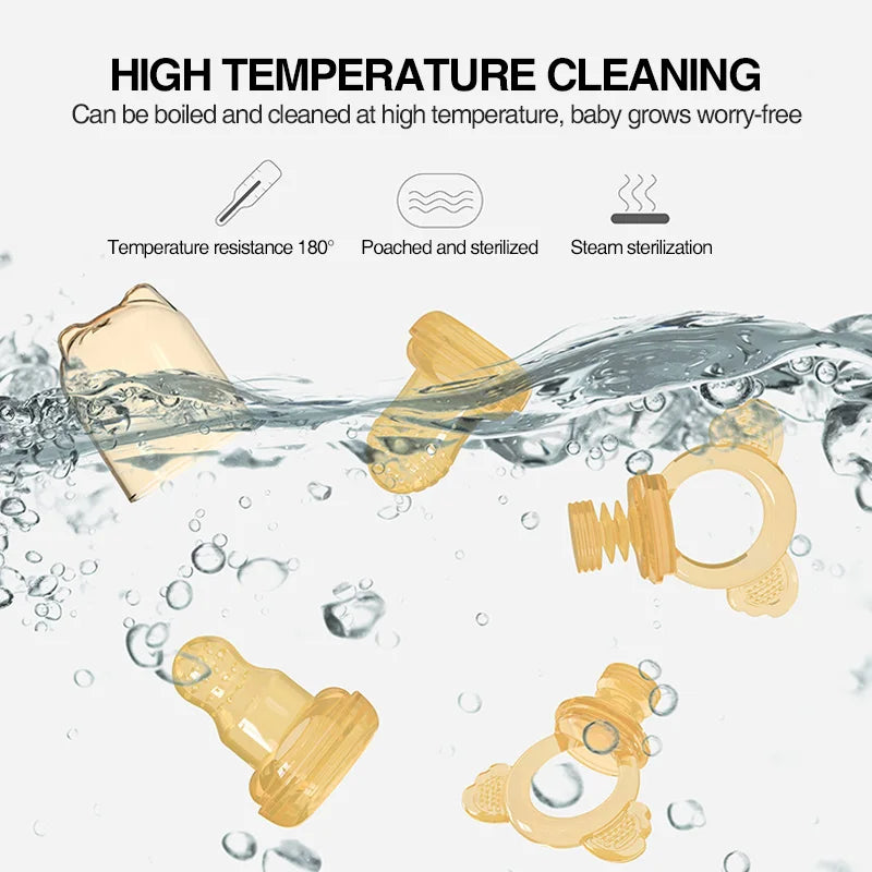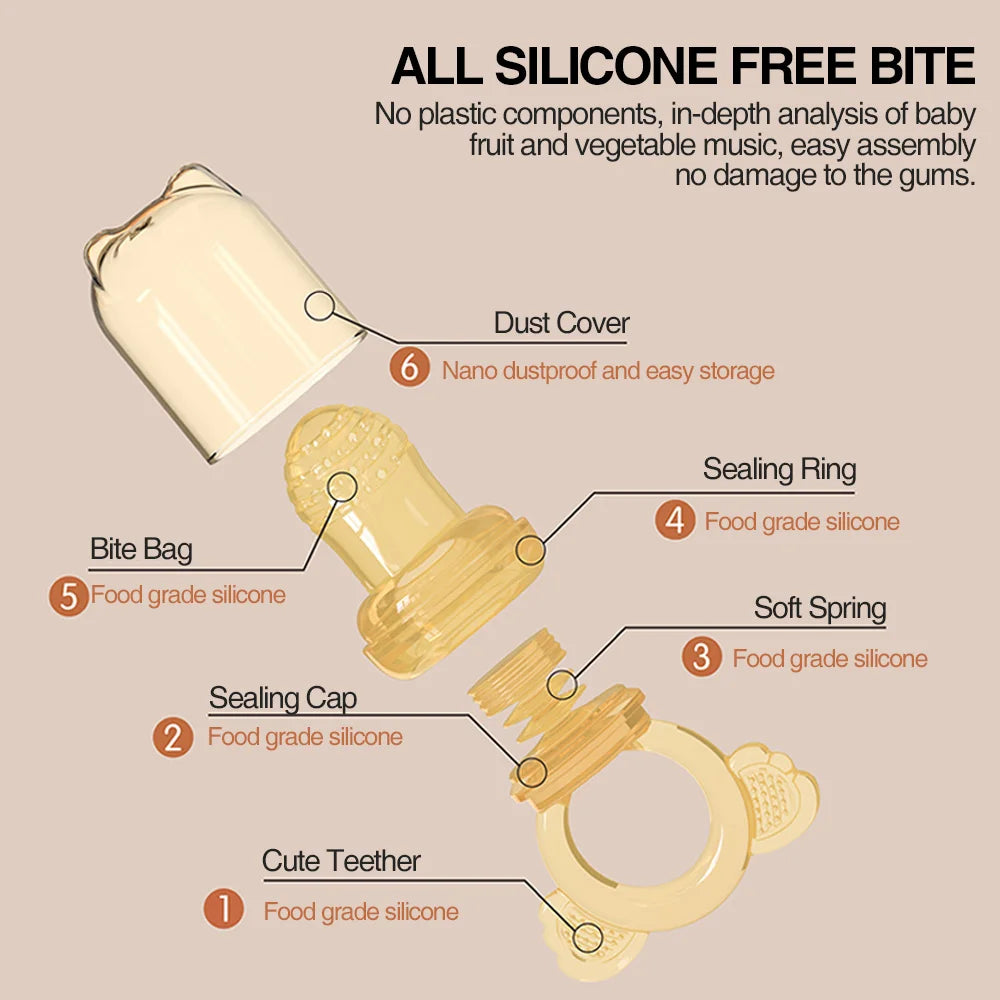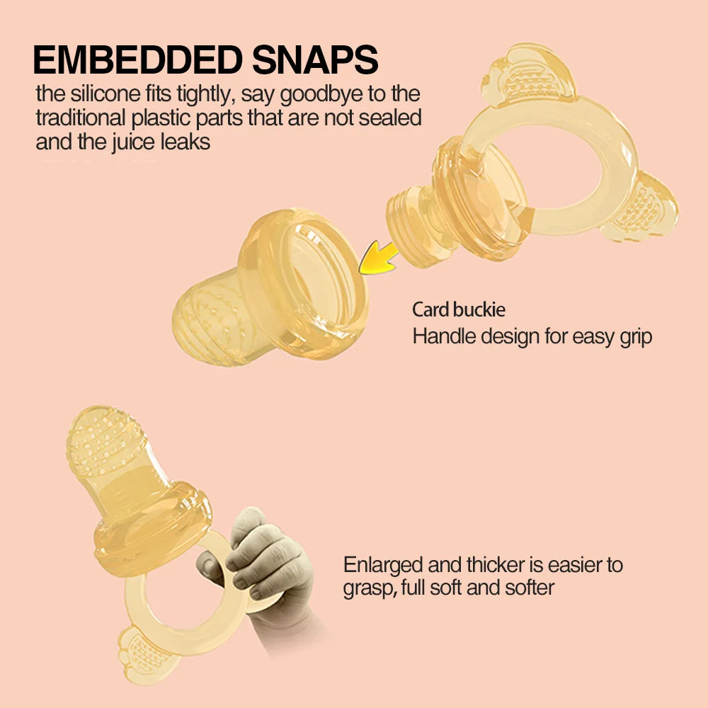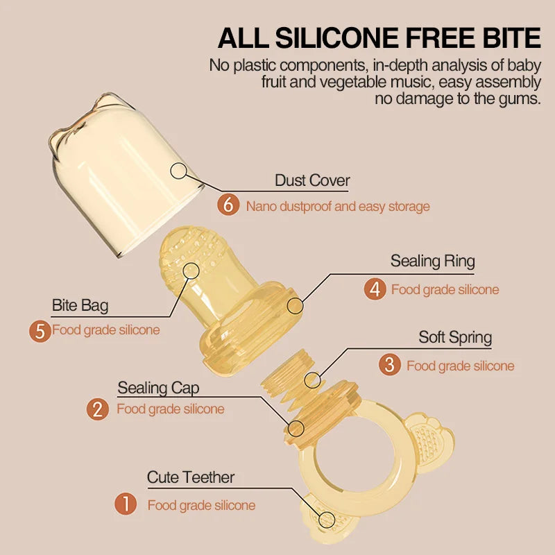 This fruit feeder is built with full silicone construction β no plastic parts, no leakage, and no gum irritation. Each detail is thoughtfully designed to make feeding simple, safe, and mess-free: